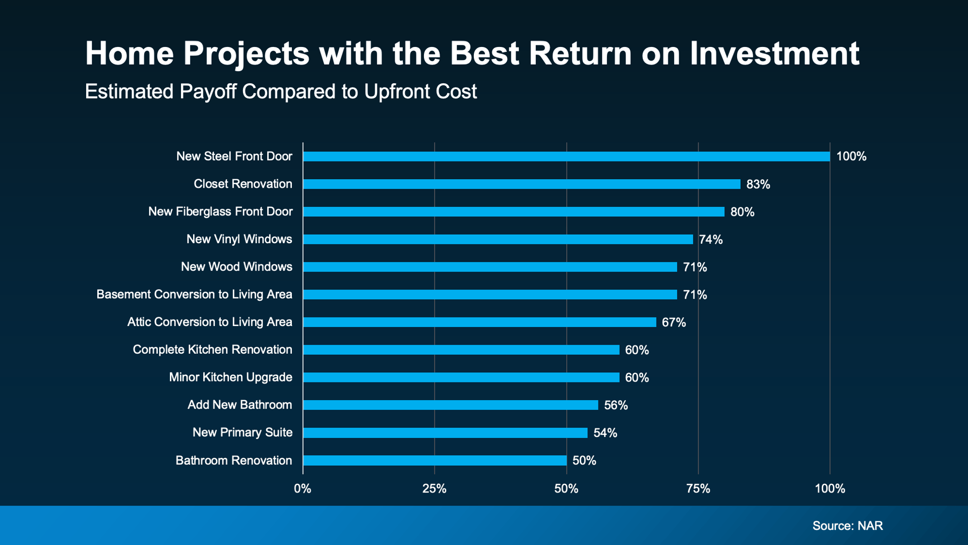 If you’re not sure which projects are worth your time and money, here's some information that can help. A study from the National Association of Realtors (NAR) shows which upgrades typically offer the best return on your investment (ROI) (see graph below):